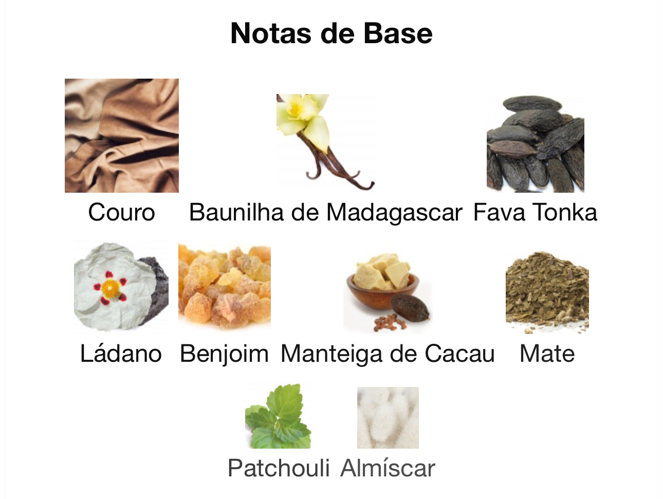 A base, por sua vez, é um convite à elegância: couro alia-se à doçura exótica da baunilha de Madagascar e à riqueza da fava tonka, enquanto ládano, benjoim, manteiga de cacau, mate, patchouli e almíscar deixam um rastro marcante e duradouro.