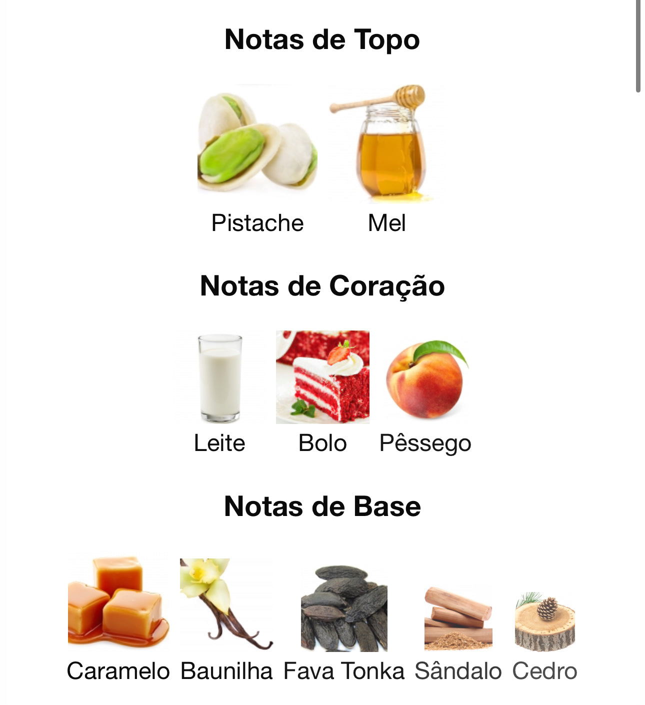 O perfume abre com o toque luxuoso e delicado do pistache coberto de mel, revelando um coração quente e reconfortante de bolo e leite cremoso, suavizado pelo pêssego.