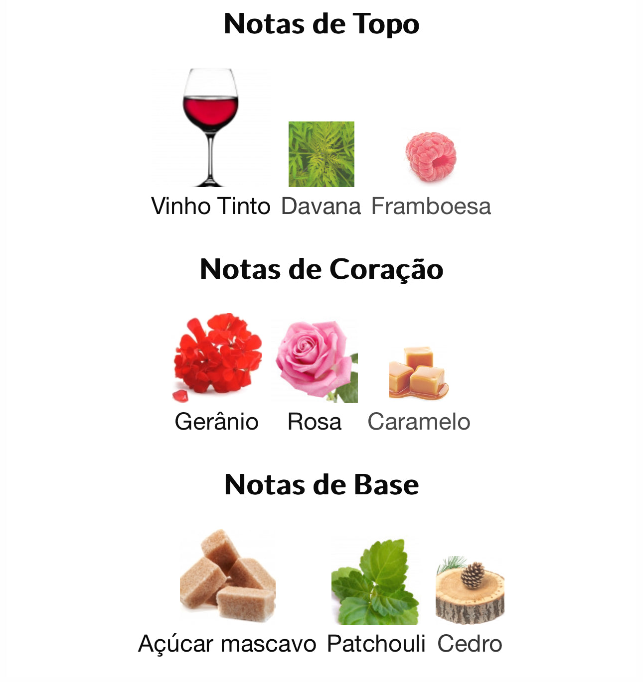 As notas de topo são: Vinho Tinto, Davana e Framboesa.