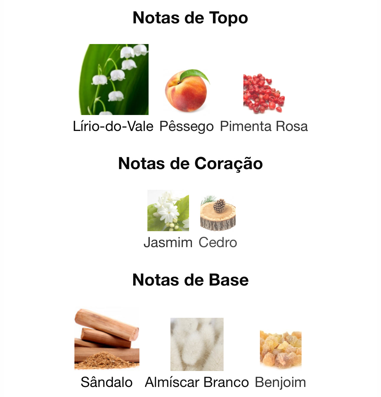 Notas de Topo: Lírio-do-Vale, Pêssego e Pimenta Rosa.