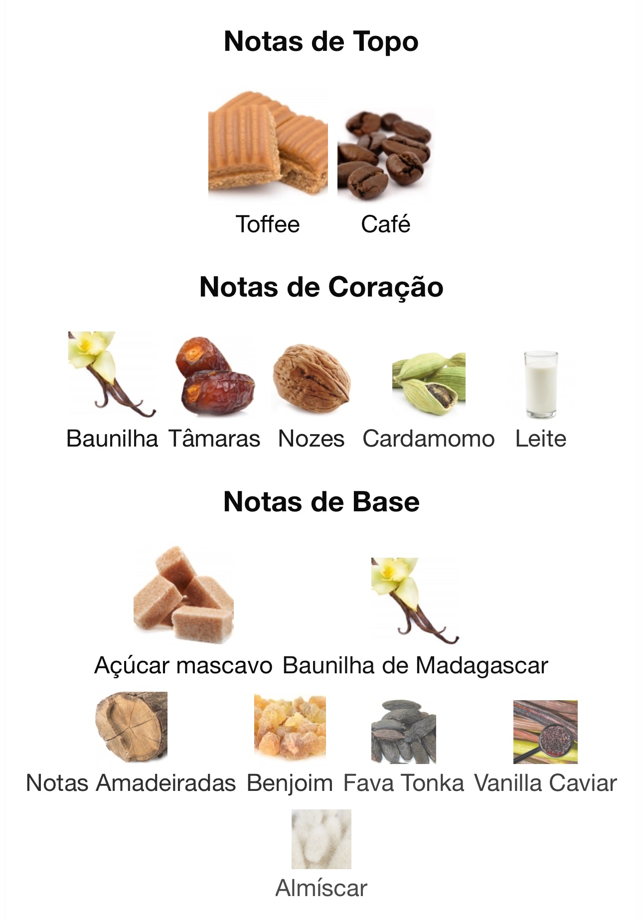 Notas de fundo: Açúcar mascavo, Baunilha de Madagascar, Notas Amadeiradas, Benjoim, Fava Tonka, Vanilla Caviar e Almíscar.