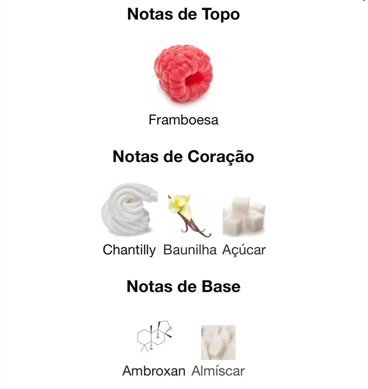 A fragrância abre com o toque frutado e luminoso da framboesa, que dá lugar a um coração cremoso e indulgente de chantilly e açúcar.