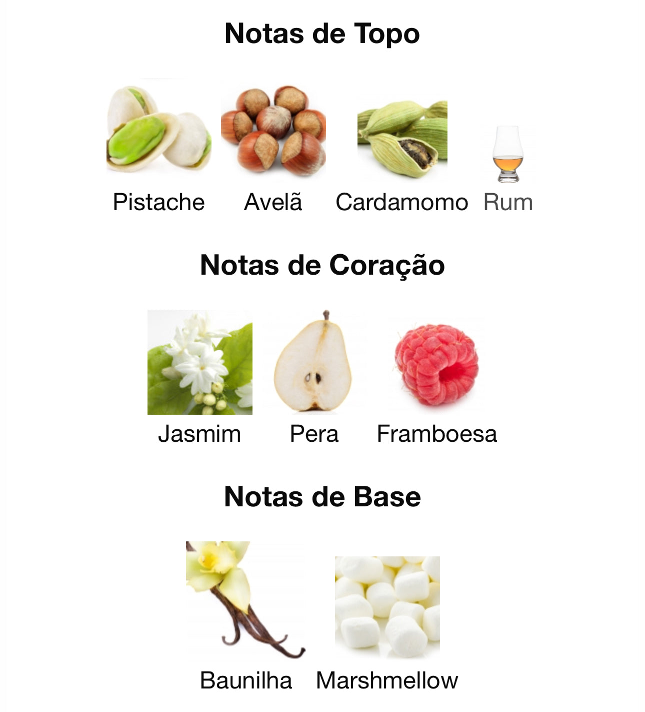 Notas de Topo: Pistache, Avelã, Cardamomo e Rum