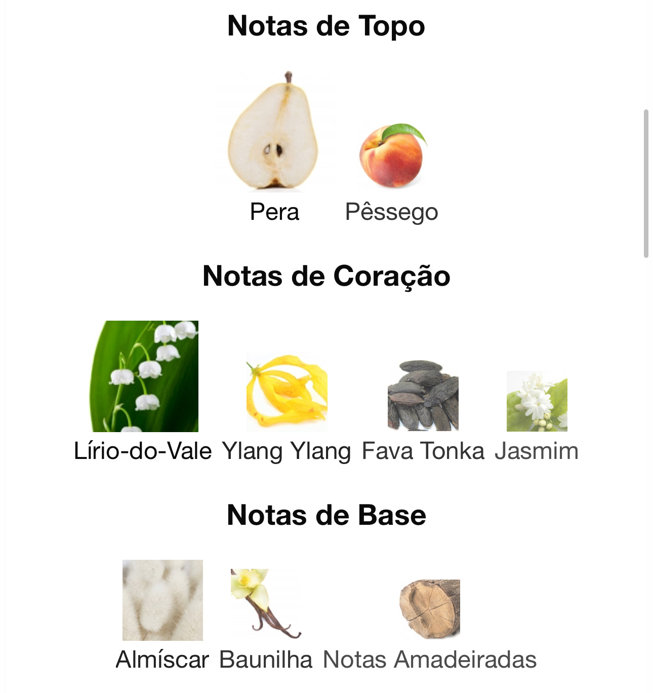 Notas de Coração: Lírio do Vale, Ylang Ylang, Fava Tonka, Jasmim