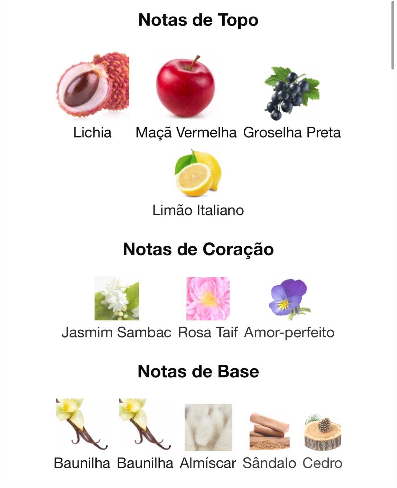Notas de Topo: Lichia, Maçã Vermelha, Groselha Preta e Limão Italiano