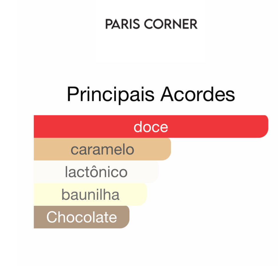 O Molten Caramel da Paris Corner é uma fragrância cremosa, doce e absolutamente viciante — uma verdadeira fusão de chocolate branco derretido, caramelo quente e baunilha suave.