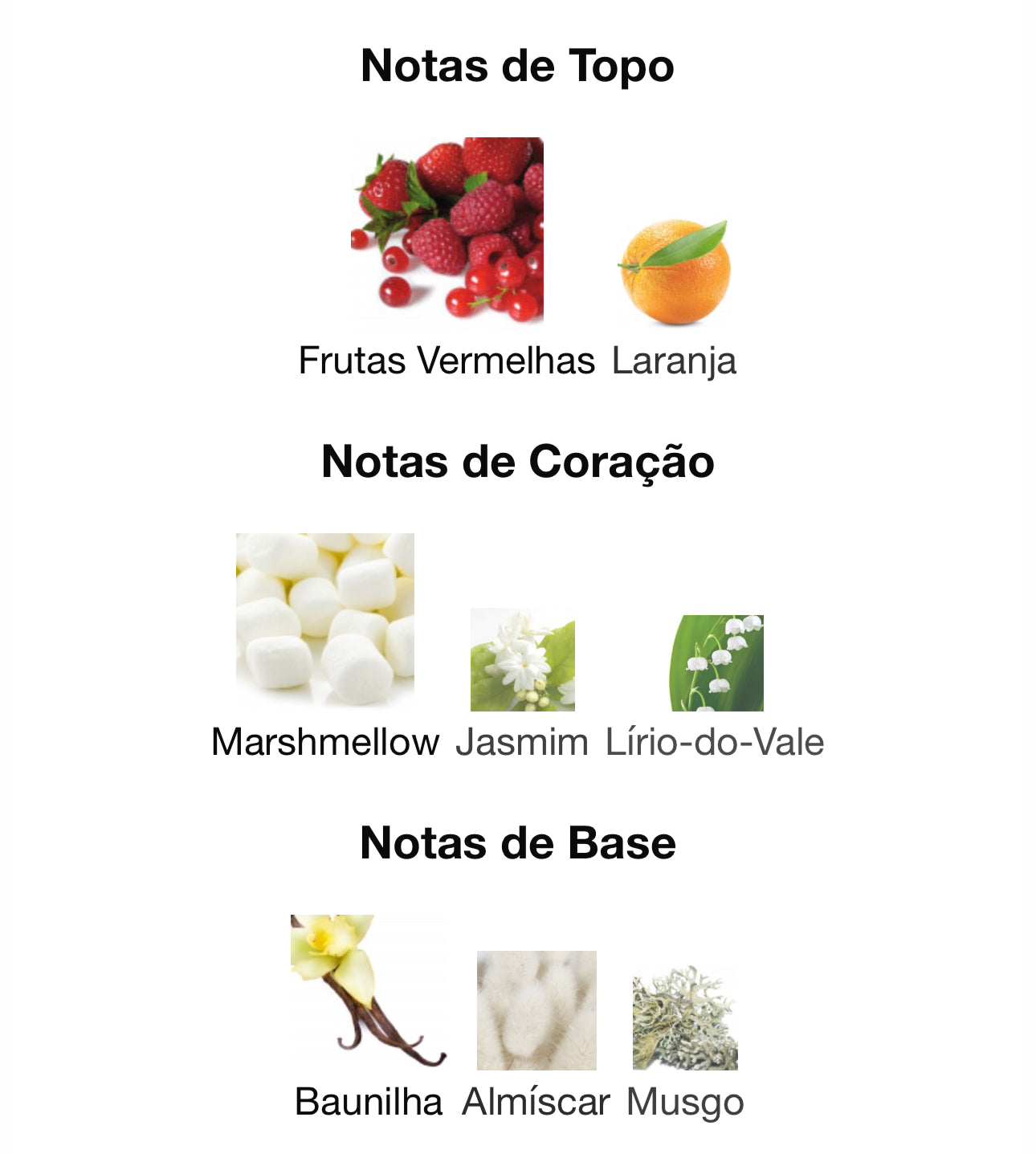 Notas de Coração: Marshmellow, Jasmim, Lírio do Vale.