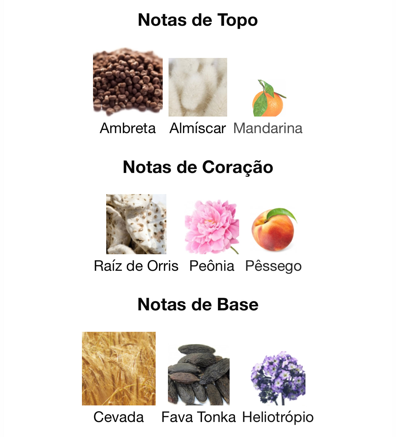 Na abertura, a ambreta, o almíscar e a mandarina unem-se numa dança vibrante e fresca, criando um convite irresistível e luminoso que desperta a curiosidade. No coração, a raiz de orris, a peónia e o pêssego revelam uma elegância delicada e envolvente, compondo um bouquet floral e frutado de rara sofisticação. Para finalizar, as notas de base de cevada, fava tonka e heliotrópio proporcionam um fundo gourmand e marcante, deixando um rastro inesquecível que perdura na memória.