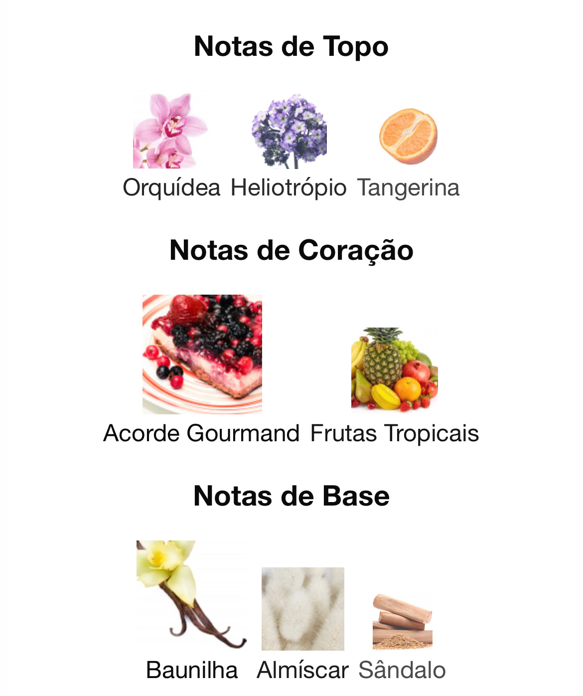 Top Notes: Heliotrope, Orchid, Tangerine Heart Notes: Gourmand Accord, Tropical Fruits Base Notes: Vanilla, Sandalwood, Musk
