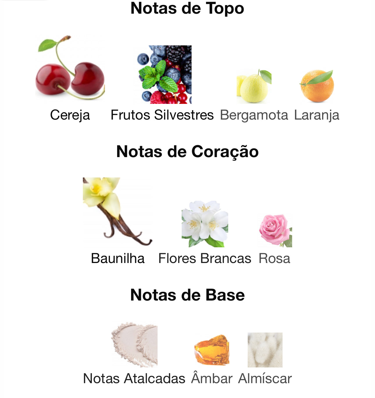 Notas de Coração: Baunilha, Flores Brancas e Rosa.