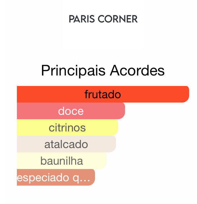 Taskeen da Paris Corner é uma fragrância única que mescla notas vibrantes e envolventes, combinando a frescura de frutas e cítricos com um coração floral e toques amadeirados. Uma experiência olfativa marcante e sofisticada, ideal para quem deseja destacar sua personalidade com elegância em qualquer ocasião.