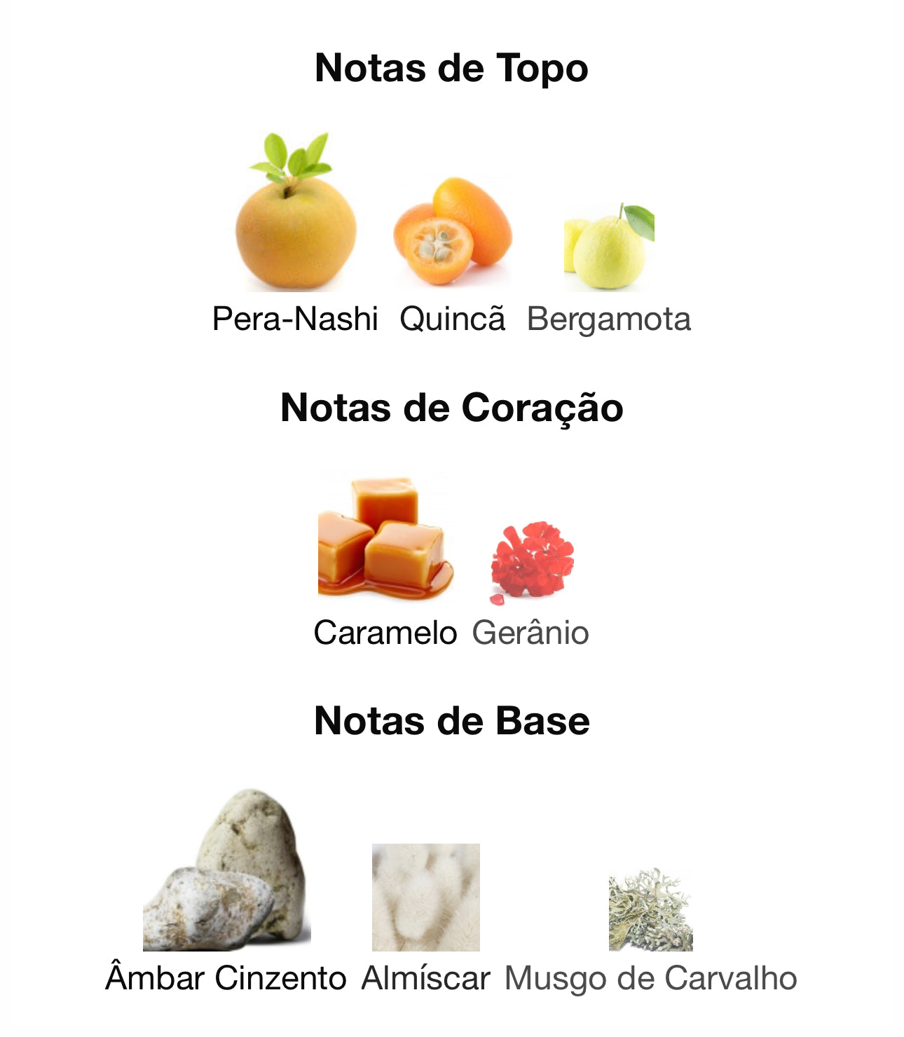 A fragrância abre com a frescura frutada da pera-nashi e da bergamota, suavemente adoçadas pelo toque do caramelo.