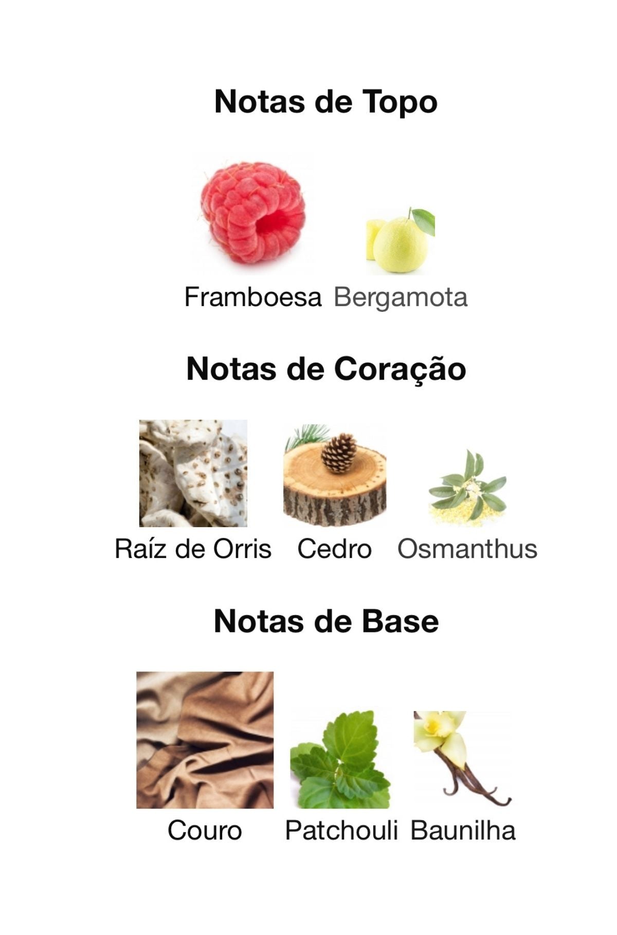 - Notas de Fundo: Couro, Patchouli, Baunilha