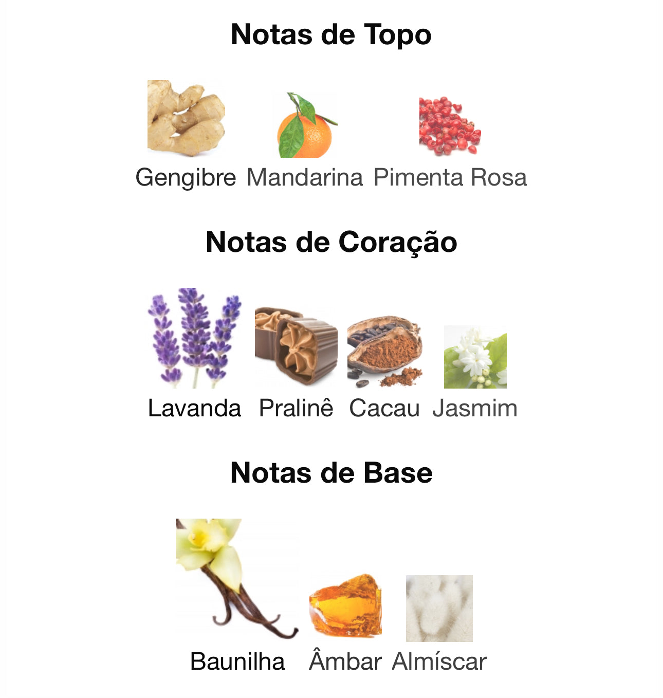 🌸 Notas de Coração: Lavanda, Pralinê, Cacau e Jasmim